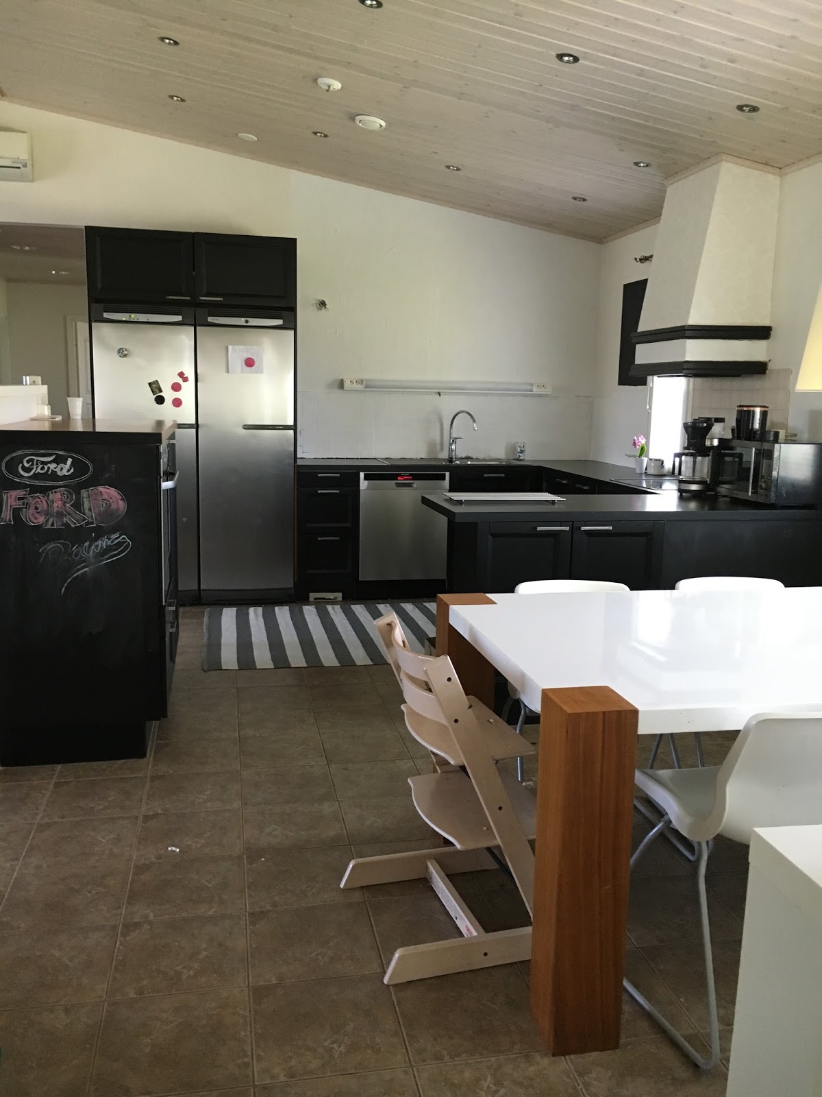 Aikalailla tässä pisteessä ollaan nyt. Muutos on ihan mieletön!! Olen todella tyytyväinen, että lähdettiin tähän projektiin, uhmattiin kaikkia lapsiperheen normeja. Remppaa piti tehdä pääasiassa illalla ja yöllä, koska lapset olivat kotona koko projektin ajan. Osittain maalasin myös päivällä, mutta se oli tehtävä ulkona...